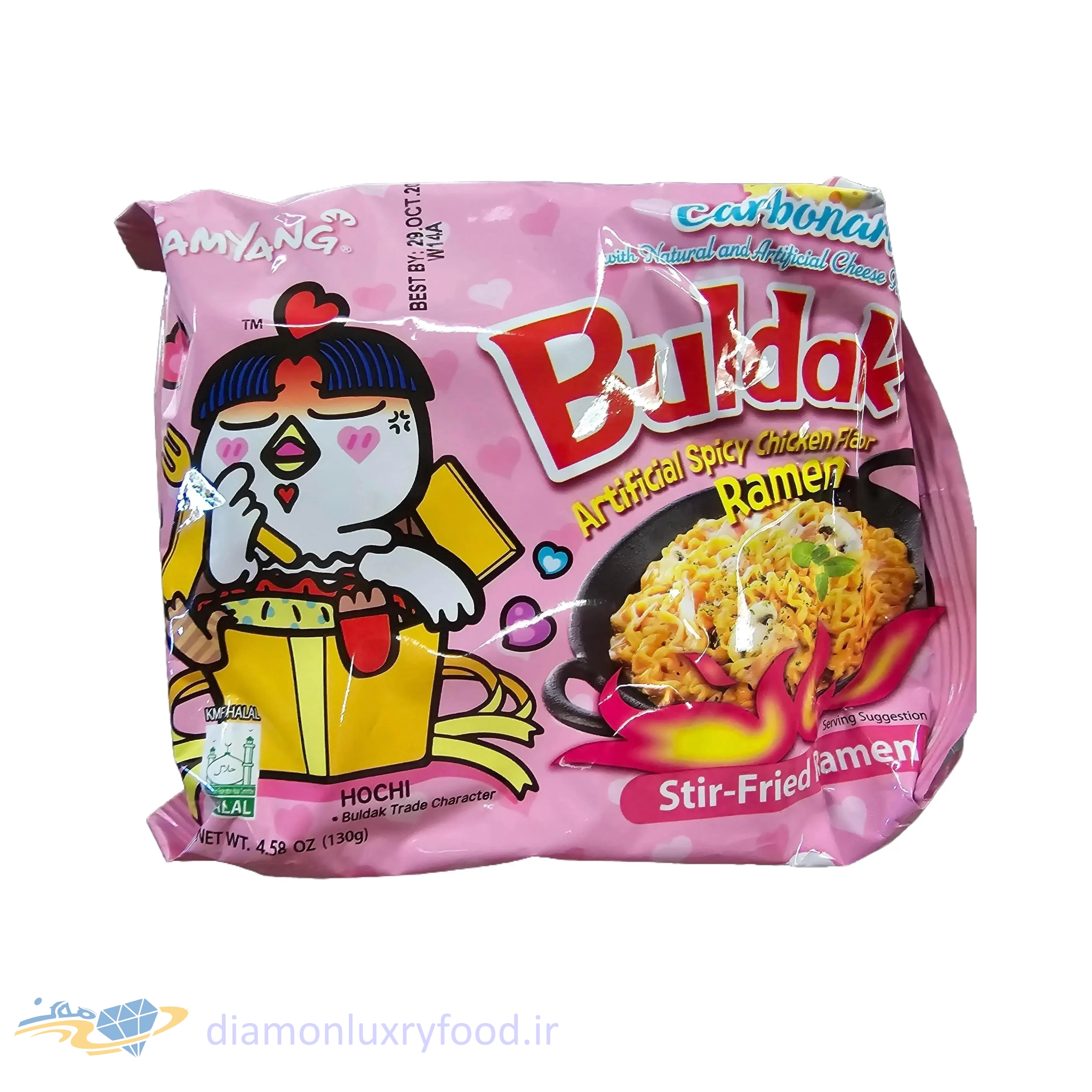 هر بسته از نودل بولداک صورتی سامیانگ مدل تند شامل ۱۳۰ گرم نودل ضخیم، سس تند مرغ و پودر کاربونارا خامه‌ایه.